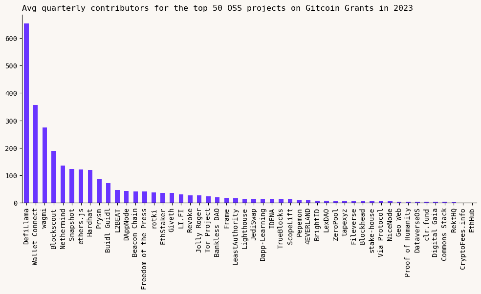 Although there are a few projects with very large contributor numbers (eg, DefiLlama, Wallet Connect, wagmi), virtually all 50 in the cohort had ongoing activity in 2023. Developer growth slowed down during the bear market of 2022/23 but did not retreat back to pre-2022 levels.