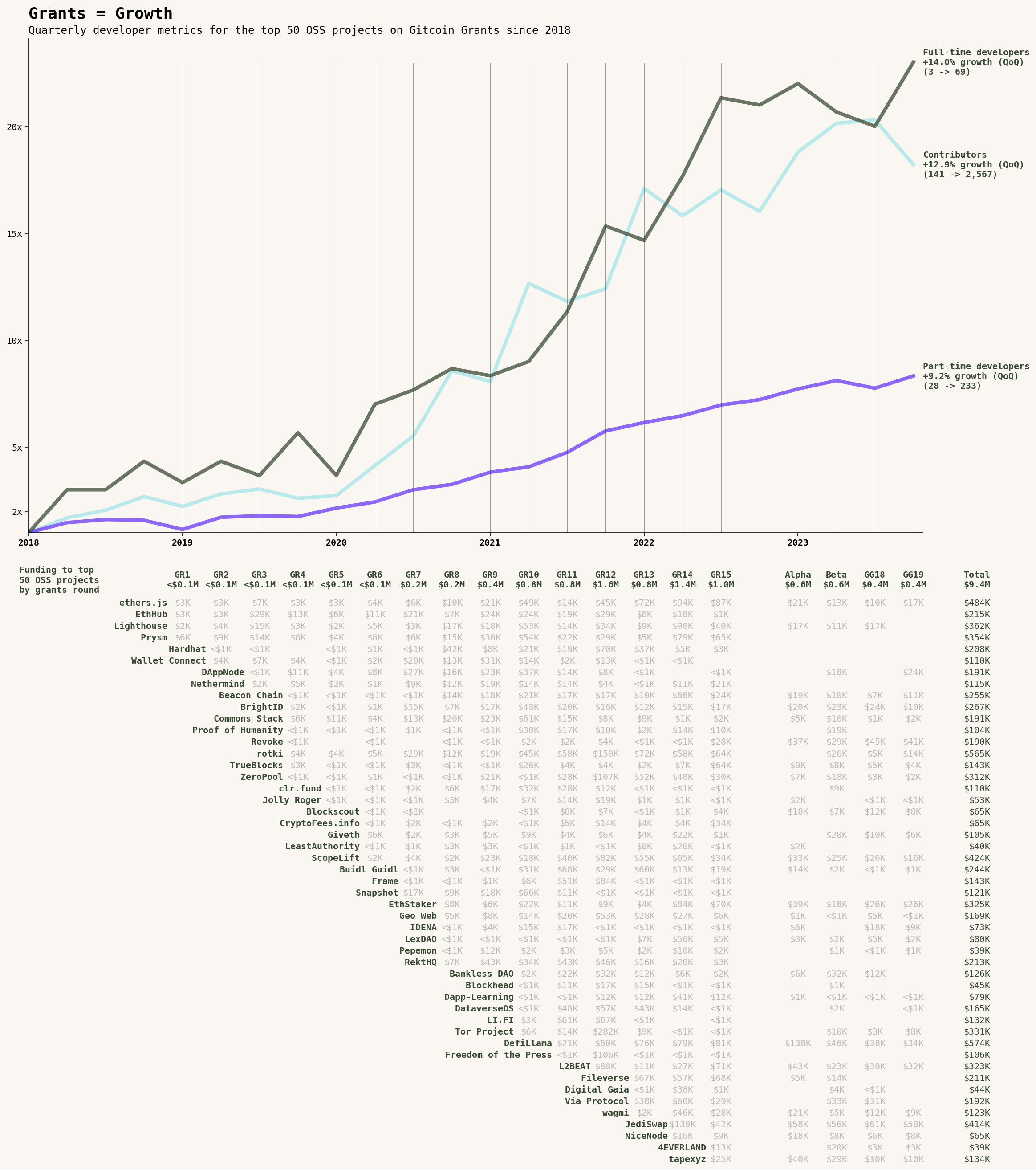 In this piece, we identify a group of 50 open source software projects that have received significant funding across multiple Gitcoin Grants rounds and then we examine the relationship between grants and growth.
