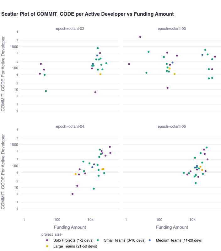 This dynamic highlights that small, underfunded teams consistently deliver higher per-developer contributions, even with modest resources, presenting opportunities for funders to target efficient projects delivering outsized impact.
