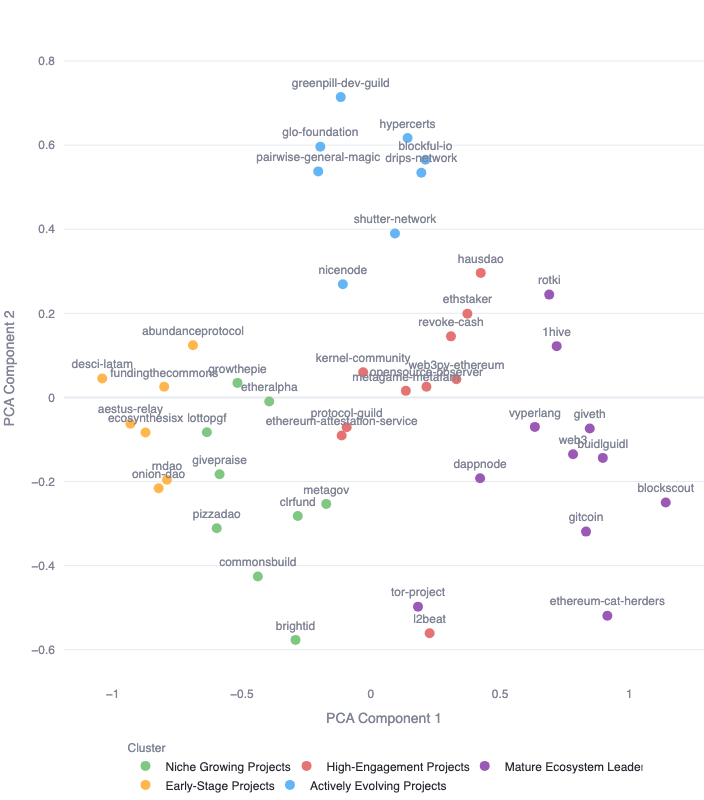 The analysis highlights the diversity of Octant's cohort of projects, underscoring the need for funding strategies tailored to the unique characteristics of each cluster. As the ecosystem scales, a one-size-fits-all approach may fail to optimize impact. Instead, designing allocation mechanisms based on clusters can better meet the distinct needs of these groups.