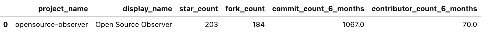 The matching records are displayed as follows. You can utilize the field project_name, say “opensource-observer”, for additional information on the grantee, as shown in the following queries.