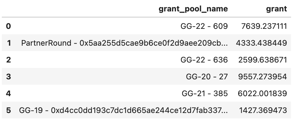 This query aggregates the total funding received by the project in each Gitcoin Grant round.