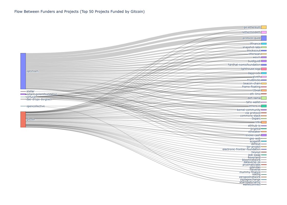 Here’s a Sankey diagram created using the outputs of the above query showing the flow of funds for top Gitcoin grantees from other ecosystems, using linked nodes and proportional flow widths to highlight relationships and the magnitude of transfers.