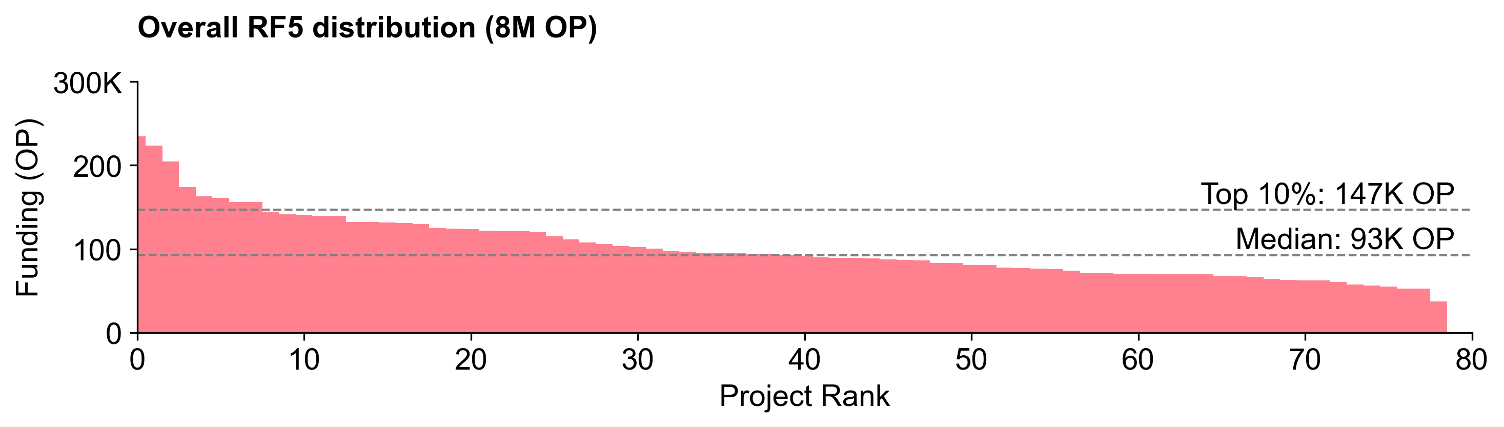 In fact, this was the flattest distribution of all five RF rounds. The top project, go-ethereum, received 235K OP (2.9% of the total). The median project received 93K. Even the lowest ranked project in Round 5 received 37K - more than what 70% of the projects in Round 4 received. It was a good round to be an “average” project in.