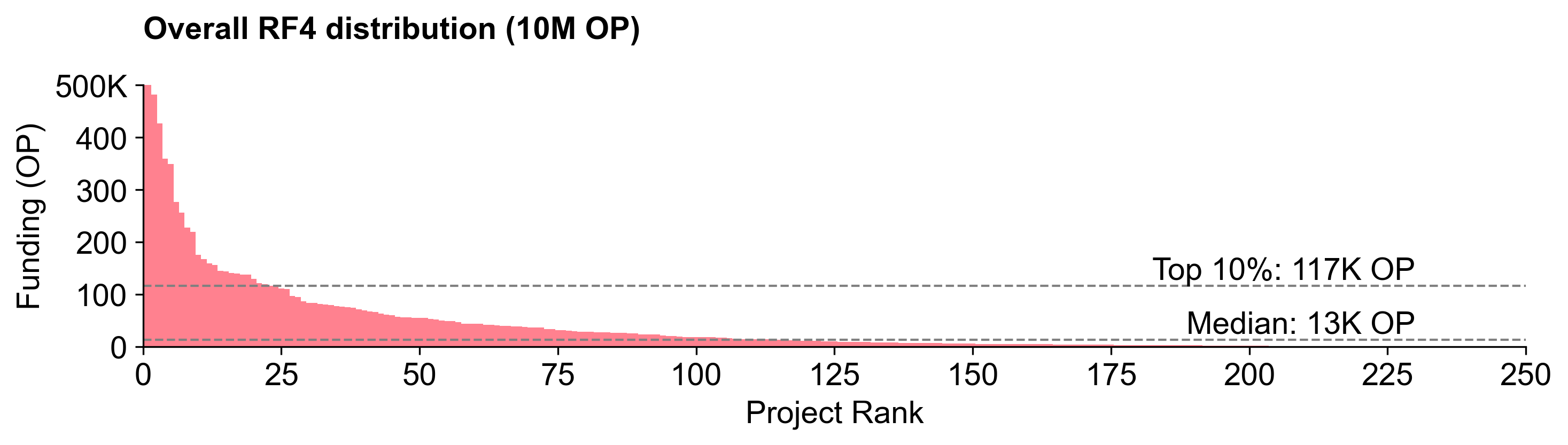 In Round 4, by contrast, there was a steep power law distribution. This was likely the result of the metrics-based voting, as top projects often had orders of magnitude more impact according to the metrics. The top projects were capped at 500K OP (2% of the total). The median project received 13K OP.