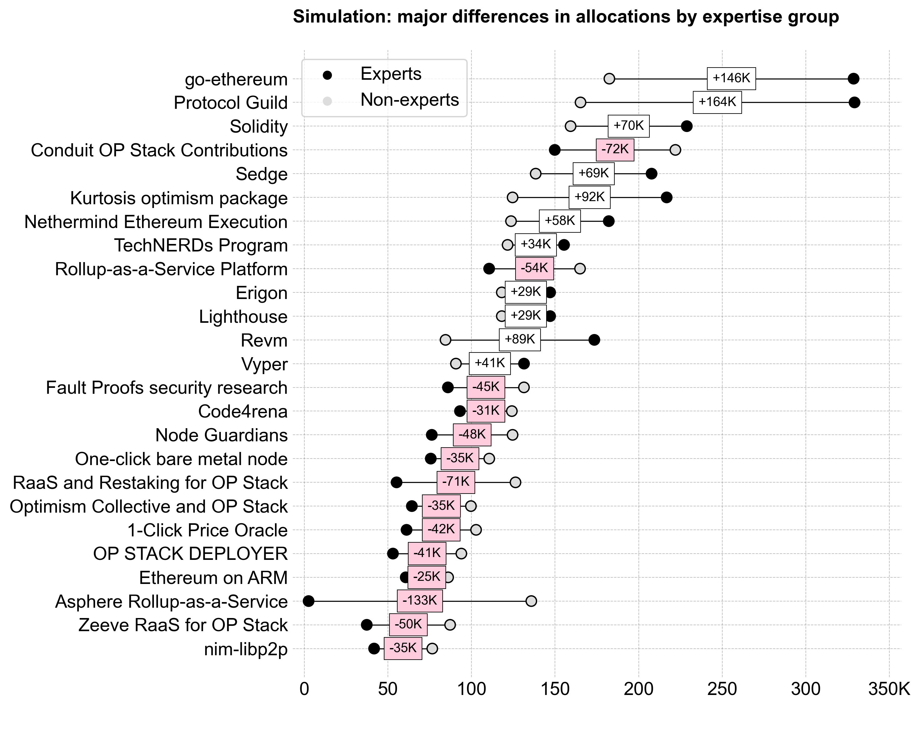 Interestingly, experts and non-experts had the smallest difference in their voting patterns for OP Stack R&D. Even experts may have struggled to differentiate projects in this category.