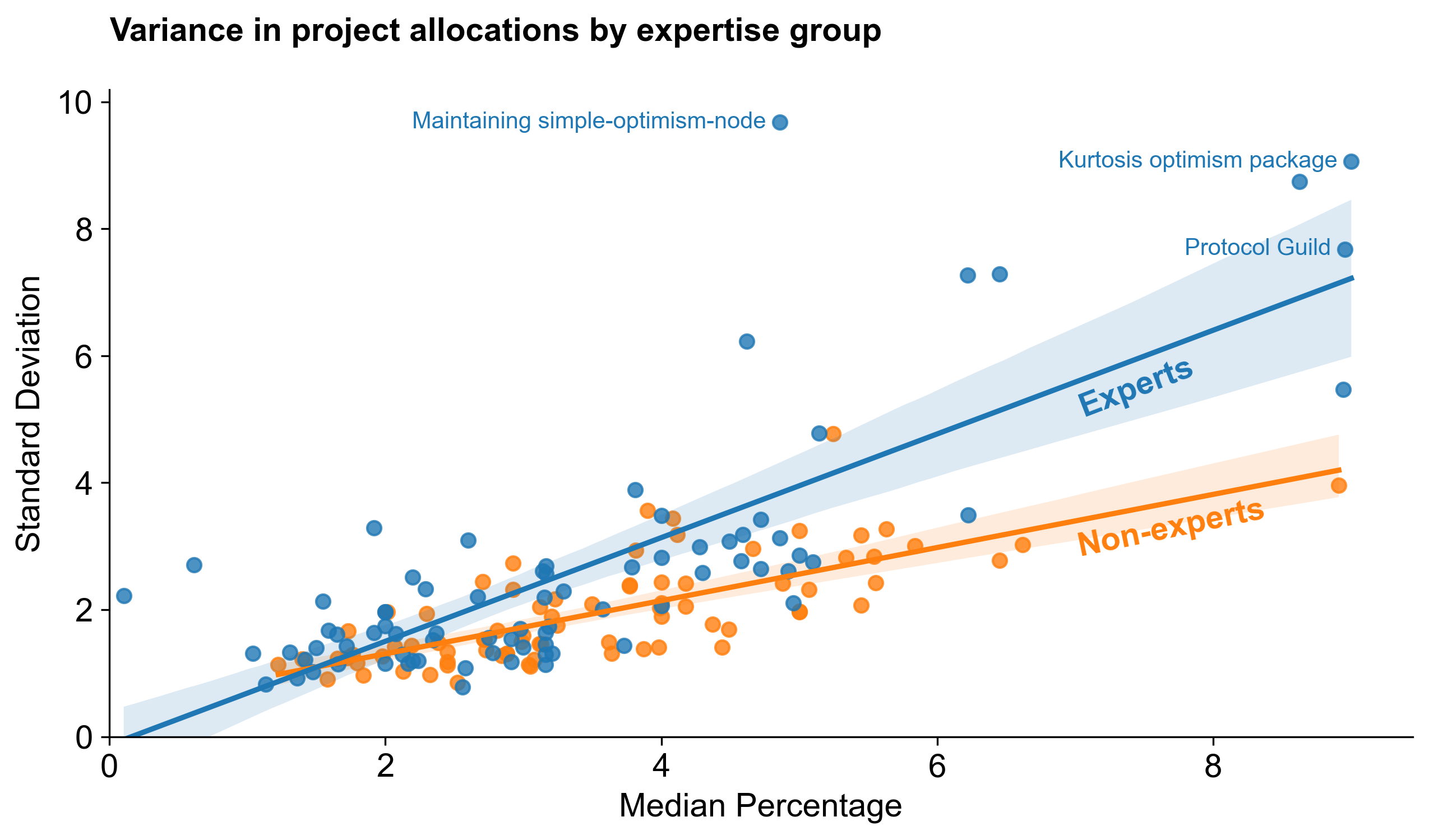 Experts’ high-assertion votes — where they allocated a significant percentage of the pool to a project they knew well — were a key factor in shaping the results. The variance between experts and non-experts is visualized below, showing the most divisive projects and the difference in standard deviation between groups.