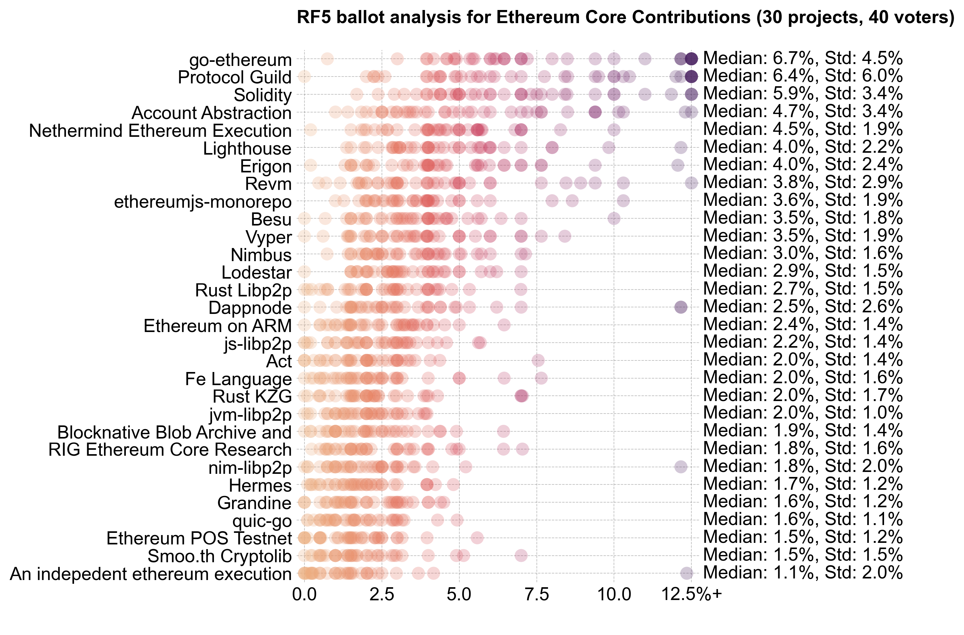 Round 3 was more of a peanut butter spread, but not as flat as Round 5. The top project (Protocol Guild) received 2.2% of the total.
