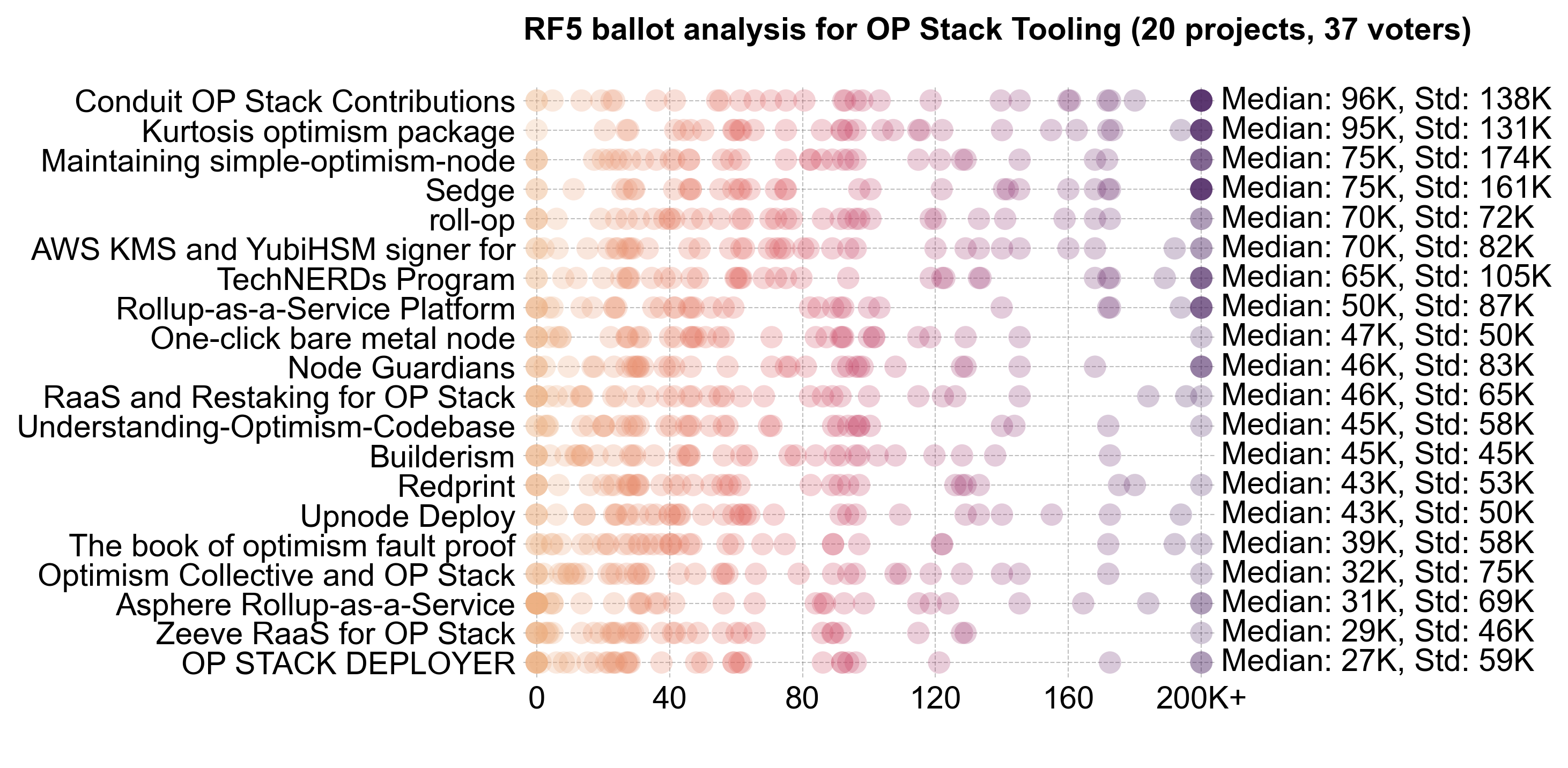 This provides additional context for the outliers in the distribution. Here is a variant on the ballot analyses shown previously, using OP Stack Tooling as an example. This version shows the implied allocation (instead of the percentage of the total pool) that the voter intended to reward the project with. The standard deviation of these absolute values is very high, and virtually every project has at least one vote equating to 200K OP or more.