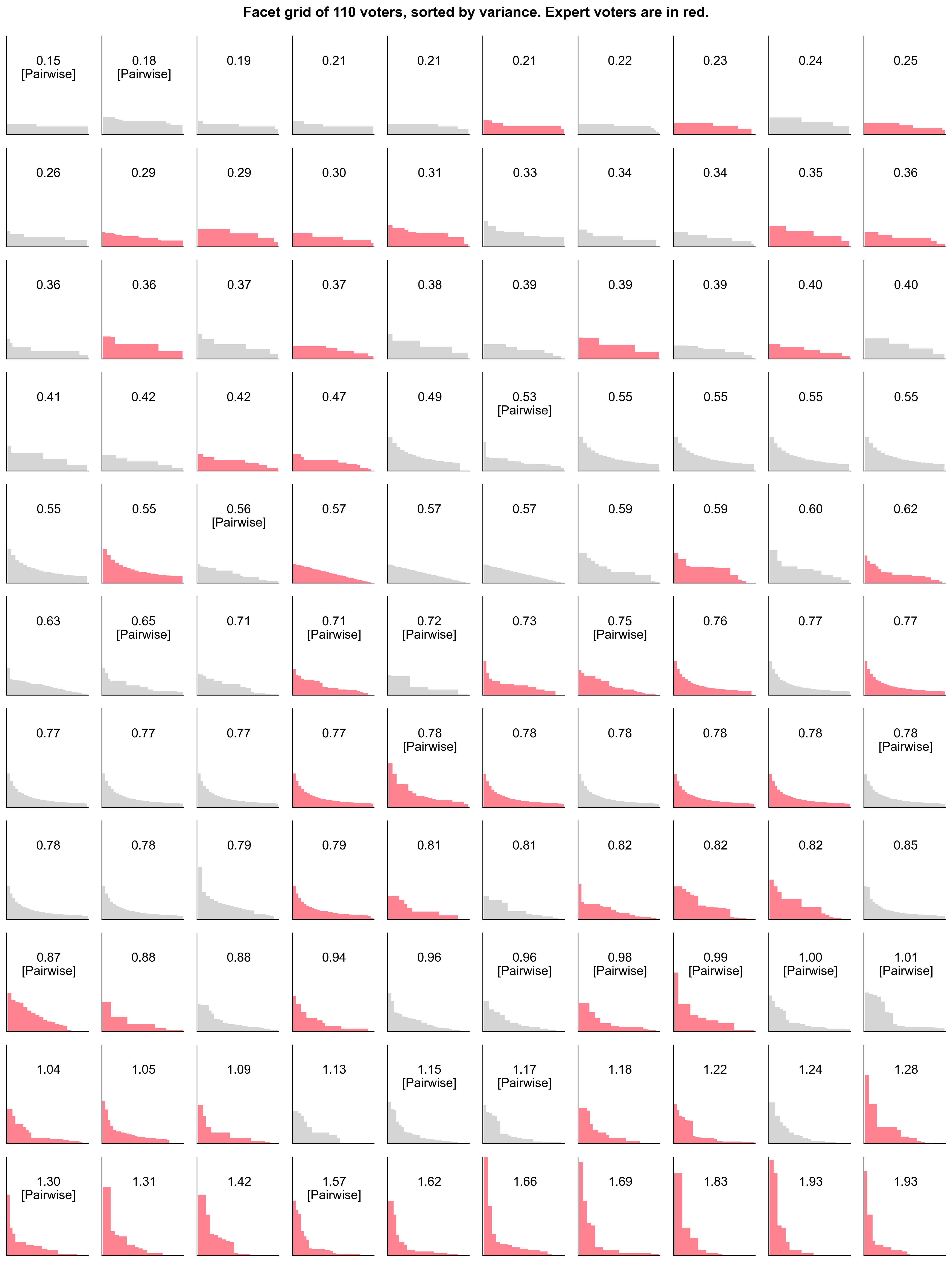 We also ran a simulation of the results if only experts or non-experts had voted. Non-experts tended to yield flatter distributions, while experts created a slightly steeper distribution curve.