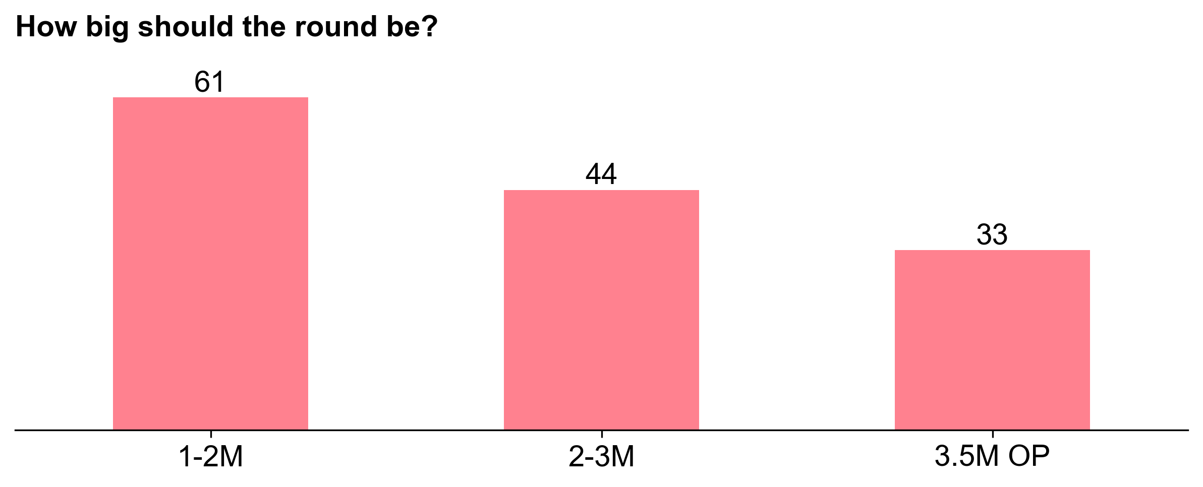 61 out of 138 voters opted for a round allocation of 1-2M OP (closer to the minimum). Only 33 voters opted for the maximum of 3.5M OP. The median value was 2.4M OP.