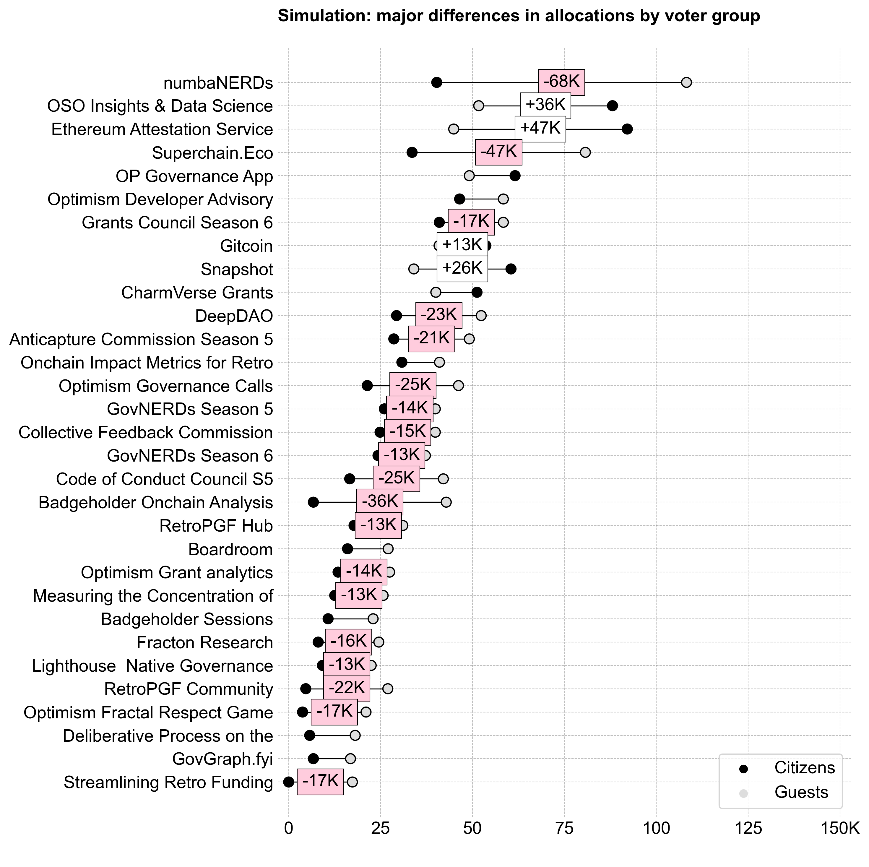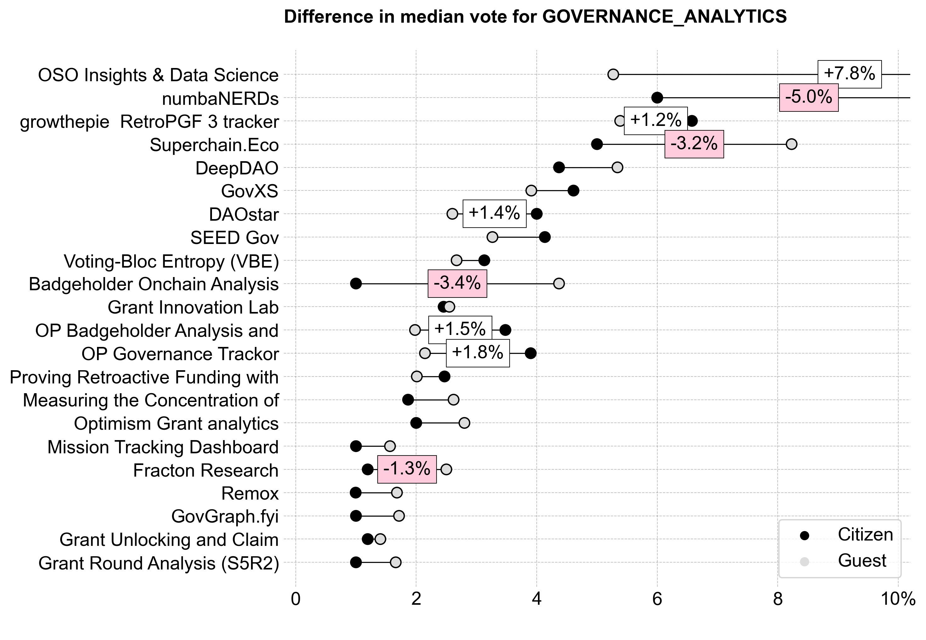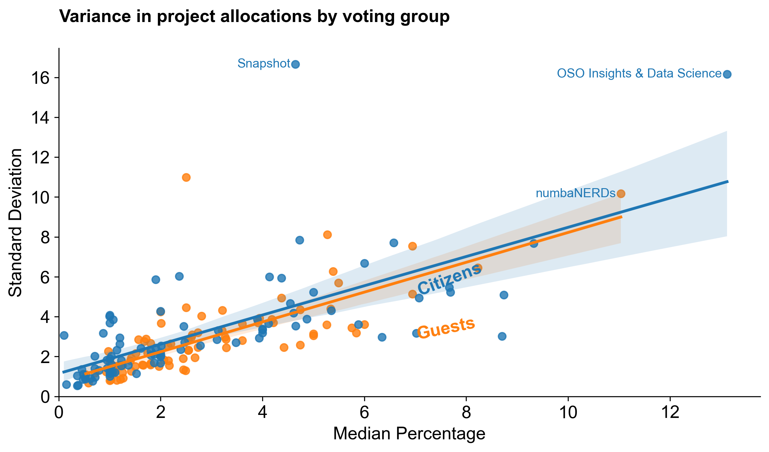 Overall, Citizens also had a much higher standard deviation in their votes for top projects than Guests. We can see this in the exhibit below, which compares the standard deviation of votes for each project over its median by group. (Only a few projects are labeled for clarity.) It's fitting that OSO ended up in the top right corner of the plot!